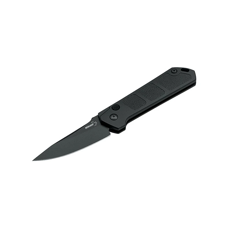 Très logiquement, le Böker Plus Kihon Auto All Black est dotĂ© d’un design entièrement noir, renforçant davantage le cĂ´tĂ© tactique. C’est un couteau automatique tactique, muni d’une lame noire de 8cm de longueur, en acier AUS-8, qui n’est pas sans rappeler une certaine Ă©pĂ©e Japonaise. Personnalisable, la lame noire est particulièrement tranchante, elle est aussi dĂ©corĂ©e par le logo Böker Plus en blanc afin de bien ressortir par contraste.