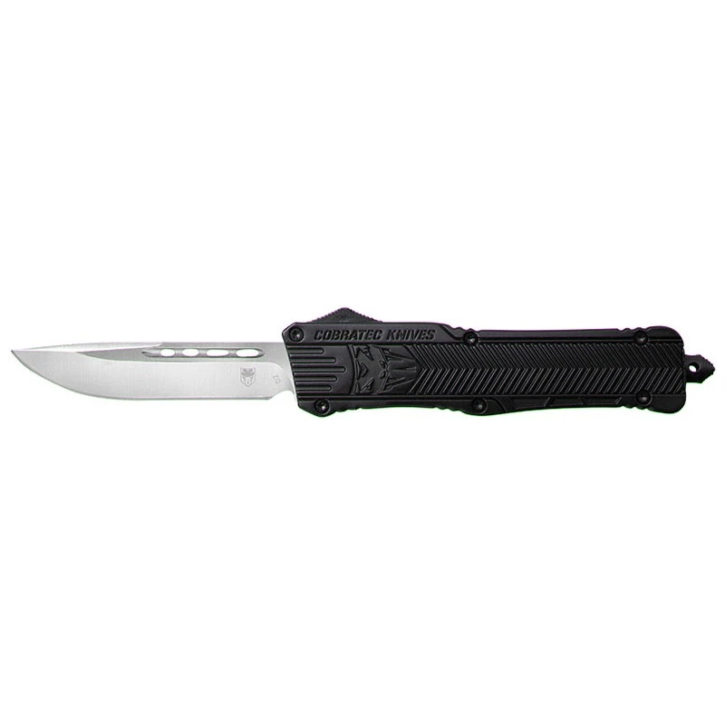 Le CobraTec CTK-1 OTF Black, modèle 06CT014, est dotĂ© d’une lame drop point de 76mm de long, en acier D2, qui est ajourĂ©e sur la partie supĂ©rieure. Marquage du logo CobraTec au bas de la face avant, possibilitĂ© de gravure en supplĂ©ment.