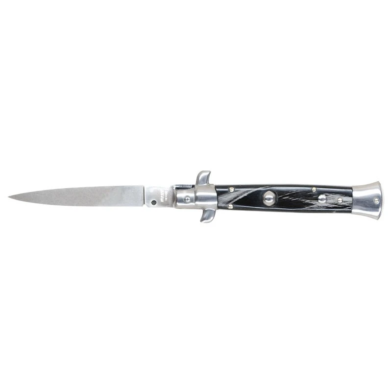 Le couteau automatique Consorzio Coltellinai Auto Stilleto avec manche en plaquettes façon corne dans sa plus petite version, ou plus petit format si vous prĂ©fĂ©rez. En effet, sa lame en acier inoxydable 440 Ă bout pointu (profil spear point) ne mesure que 85mm de longueur. Une petite lame tranchante ainsi que rĂ©sistante Ă la corrosion, sur laquelle il sera possible d’inscrire le texte de son choix (voir bouton ajouter une gravure ci-dessous). Il faut souligner la vitesse de dĂ©ploiement ultra rapide de la lame grâce au mĂ©canisme automatique. Soyez prĂŞts Ă affronter tous les dangers, d’autant plus que ce modèle Auto Stilleto B250-20 signé Consorzio Coltellinai (marque Italienne) est très transportable. Difficile de rĂ©sister Ă l’Ă©lĂ©gance du manche synthĂ©tique avec habillage façon corne sombre, avec un coloris qui contraste parfaitement avec le gris des mitres. Ce couteau automatique vous apportera l’efficacitĂ©, la transportabilitĂ© et l’Ă©lĂ©gance dont vous avez besoin, et tout ça pour un tarif relativement abordable.