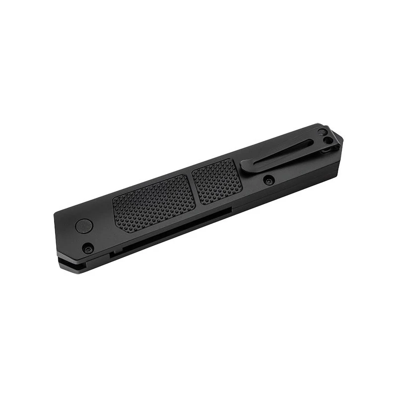 Le manche du couteau automatique est ici fait d’aluminium lĂ©ger noir, Ă la texture antidĂ©rapante favorisant la prise en main. D’une longueur d’environ 12cm, il intègre un trou de lanière dissimulĂ© ainsi qu’un clip rĂ©versible. LivrĂ© avec son étui en nylon de haute qualitĂ©.