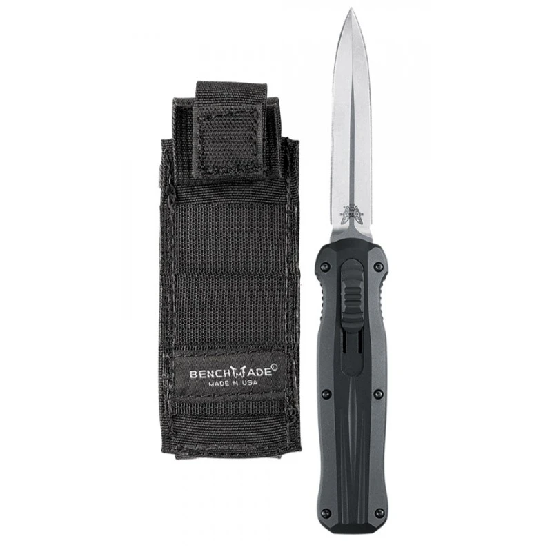 Le Benchmade Pagan BN3320 est un couteau automatique Out The Front conçu et fabriquĂ© aux Etats-Unis (made in USA). Il possède un manche lisse fabriquĂ© en aluminium noir pour une prise en main des plus agrĂ©ables. Le bouton glissière tombe parfaitement sous le pouce et permet ainsi de dĂ©ployer rapidement d’une seule main la lame en acier inoxydable 154CM qui est Ă©jectĂ©e par l’avant. Une lame au double tranchant lisse, biseautĂ©e d’un seul cĂ´tĂ©, mesurant 10cm de longueur, sur laquelle on peut observer le logo de la coutellerie AmĂ©ricaine Benchmade (motif papillon). Cette mĂŞme lame Spear Point est personnalisable au moyen d’une gravure (voir bouton ci-dessous). Facile Ă transporter, le couteau automatique OTF Benchmade Pagan 3320 ne mesure que 128mm de long lorsqu’il est en position fermĂ©e. On notera Ă©galement la prĂ©sence d’un clip pour une utilisation quotidienne comme couteau de poche. Compatible MOLLE, le Benchmade Pagan BN3320 OTF est aussi livrĂ© avec son Ă©tui de protection type Cordura. Parfait pour en prendre le plus grand soin !