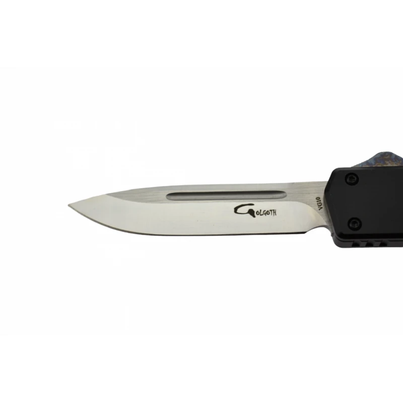 Le Golgoth G13DP+ est un couteau automatique Ă ouverture frontale performant, au design sobre avec toutefois quelques touches d’originalitĂ©. Ce modèle est caractĂ©risĂ© par une lame de forme drop point de 8cm, conçue en acier inoxydable VG-10. RainurĂ©e sur la partie supĂ©rieure, elle est aussi marquĂ©e par le logo Golgoth et personnalisable par gravure en option facultative. L’acier employĂ©, Ă savoir le VG10, est aussi inscrit sur la lame de façon discrète.