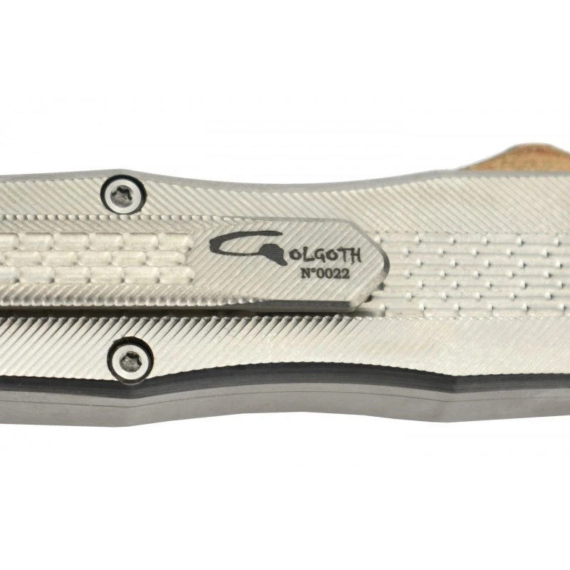 Le Golgoth G7 est le graal du couteau automatique OTF, avec une qualitĂ© extrĂŞme, notamment au niveau des finitions. Ce modèle se distingue par son manche en titane TC4 avec anodisation dure, sur le cĂ´tĂ©, on observe un bouton latĂ©ral en laiton qui une fois poussĂ©, permet le dĂ©ploiement de la lame. Ce bouton poussoir permet d’apporter une petite note colorĂ©e en parfaite harmonie avec le design de la poignĂ©e mesurant 103mm de longueur. Le Golgoth G7 se transporte ainsi avec Ă©normĂ©ment de facilitĂ© quotidiennement ! C’est d’autant plus vrai en raison de la prĂ©sence au dos d’un clip-ceinture en titane, marquĂ© par le logo Golgoth en noir.