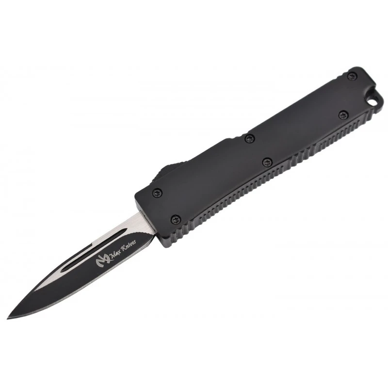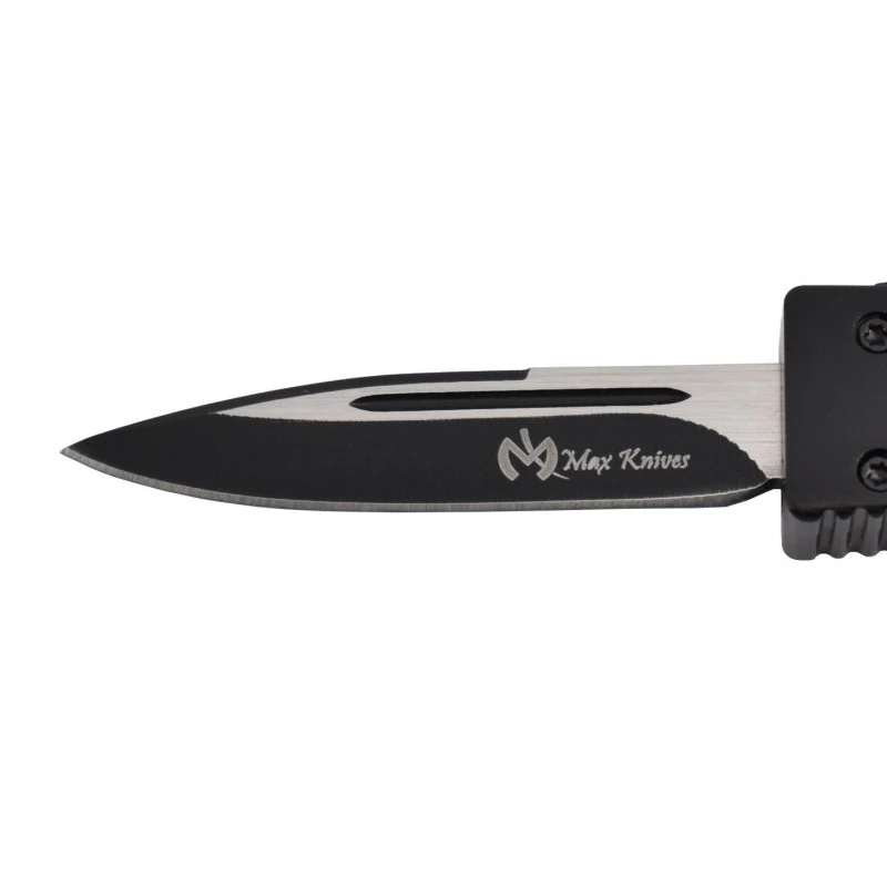 Le Max Knives MKO30 est un couteau qui a tout pour plaire, sans exception. C’est un couteau automatique OTF, Ă ouverture frontale, et donc par dĂ©finition très simple d’utilisation, il n’y a qu’Ă utiliser le bouton ergonomique du manche noir pour actionner la lame. Cette dernière mesure 5cm de long, elle est bicolore ce qui apporte une touche de style, d’Ă©lĂ©gance, elle est de ce fait en parfaite harmonie avec la poignĂ©e noire en aluminium anodisĂ©, gage d’ergonomie et de robustesse. Tranchante, la lame est marquĂ©e par le logo Max Knives, et peut ĂŞtre gravĂ©e par un texte, une inscription au choix, sur les deux faces. Le manche noir mesure prĂ©cisĂ©ment 82mm de long ce qui assure un transport simple et sans encombre quotidiennement, c’est d’autant plus vrai par la prĂ©sence d’un passe-lacet en bout. Le couteau automatique OTF Max Knives MK030 est ici noir, mais il existe aussi en rouge afin d’apporter une note colorĂ©e Ă vos aventures.