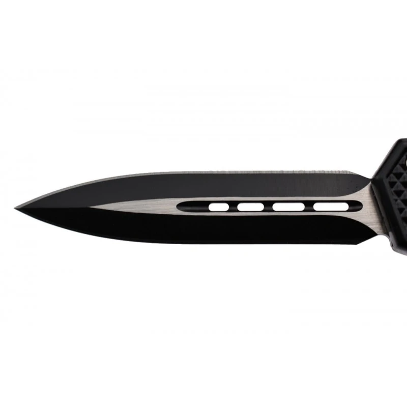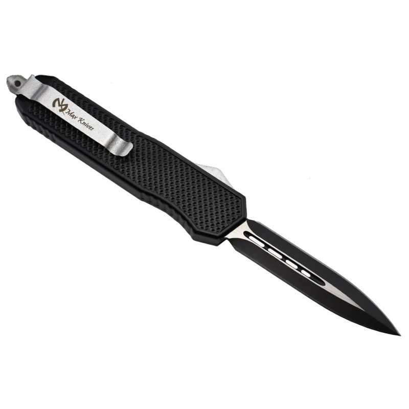 Le Max Knives MKO46DT est un couteau automatique OTF qui ne vous dĂ©cevra jamais sur le terrain. De style tactique, il bĂ©nĂ©ficie d’un tranchant double, orchestrĂ© par une lame de forme spear point conçue en acier inoxydable. D’une longueur de 9cm, elle est finement ajourĂ©e au niveau du centre, par des formes rectangulaires aux coins arrondis dont les tailles sont de plus en plus grandes. Bicolore (coloris noir et gris), la lame sĂ©duira Ă©galement la galerie par son design atypique.
