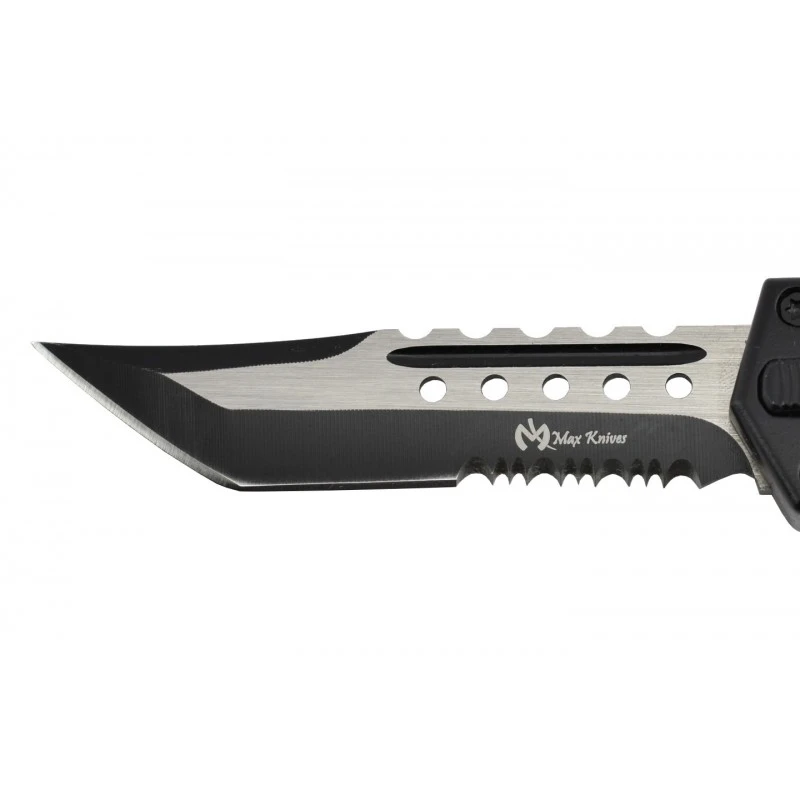 Le Max Knives MKO5 est un couteau automatique OTF muni d’une lame de 9cm de longueur, de forme tanto, et au tranchant semi-dentelĂ©. AjourĂ©e par cinq trous, la lame mixte est grise et noire, ainsi que dĂ©corĂ©e par le logo Max Knives, son tranchant est redoutable.