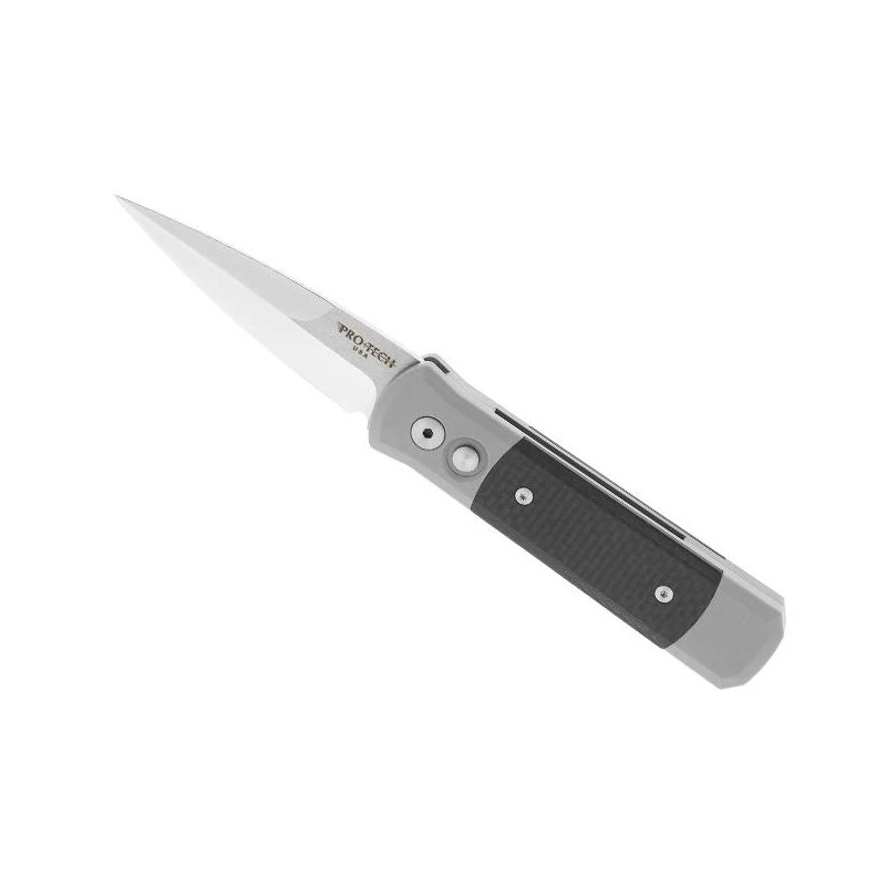 Ce couteau automatique Pro-Tech Godson, modèle 700CF, est le laurĂ©at du couteau de l’annĂ©e 2014 (Blade Magazine). Il possède ici un manche de 115mm de longueur, en aluminium 6061-T6, avec inserts fibre de carbone pour une apparence très design, particulièrement soignĂ©e. Le joli manche intègre un clip au dos, permettant de transporter le couteau automatique Godson CF avec toujours plus de facilitĂ©, d’aisance. La poignĂ©e intègre un bouton permettant un dĂ©ploiement rapide et efficace de la lame lisse et tranchante.