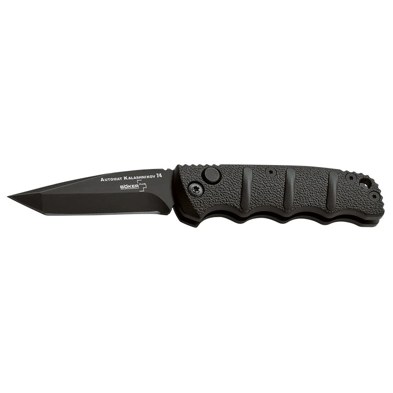Ce modèle 01KALS73BT est une version rĂ©duite ou encore miniature du cĂ©lèbre couteau automatique Böker Plus, sĂ©rie Kalashnikov. Toujours fait d’aluminium noir, son manche ne mesure ici que 83mm de longueur, une taille permettant de toute Ă©vidence de le ranger dans une poche sans rencontrer la moindre difficultĂ©. La poignĂ©e est texturĂ©e pour un look plus accrocheur mais aussi une meilleure prise en main. MĂŞme si l’encombrement du mini couteau automatique est minime, ce dernier intègre Ă©galement un clip noir au dos pour pouvoir le transporter Ă la poche ou Ă la ceinture. D’une longueur de 64mm, la lame est de forme tanto, et fabriquĂ©e en acier inoxydable AUS-8 avec revĂŞtement noir. Pour la dĂ©ployer, rien de plus simple, il suffira d’appuyer sur le bouton du manche. Un gabarit plus compact mais des performances qui restent intactes !