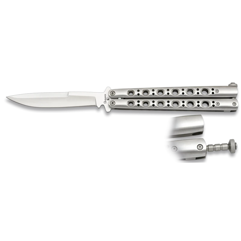DotĂ© d’un excellent rapport qualitĂ©/prix, ce modèle de couteau paipllon possède une lame de 11,2cm en acier inoxydable : elle est marquĂ©e par le logo Albainox. Vous avez la possibilitĂ© de graver la lame de votre couteau papillon Albainox par le texte de votre choix. Le manche lui est fabriquĂ© en aluminium, il est ajourĂ© par 12 trous (2 x 6 trous) ce qui lui confère une apparence très Ă©lĂ©gante. L’aluminium est un matĂ©riau rĂ©sistant et ergonomique : il est agrĂ©able au toucher et la prise en main est parfaite. Ă€ fermeture ajustable, le couteau papillon Albainox 02109 sera parfait pour offrir du fait qu’il est vendu avec sa boĂ®te colorĂ©e.