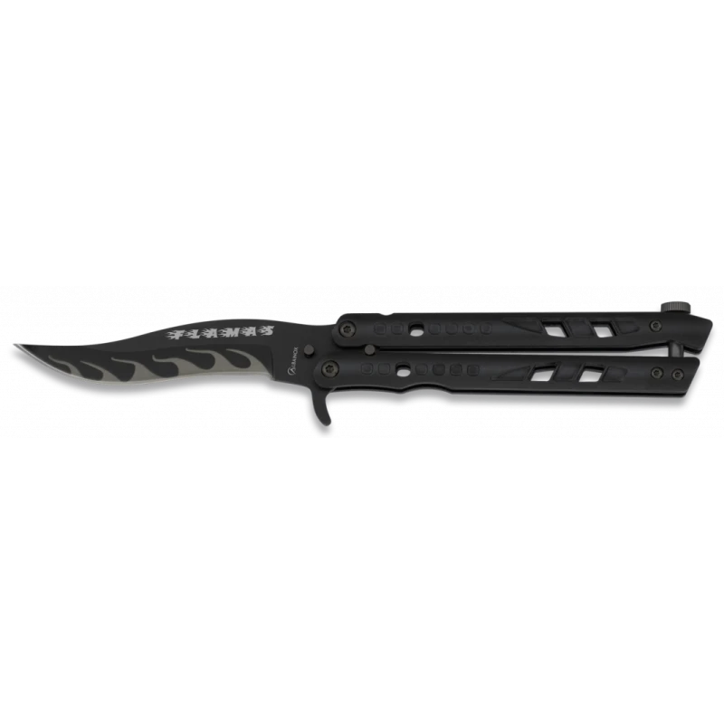 Le couteau papillon Albainox Flamas (rĂ©fĂ©rence 02138) doit son nom en raison de sa lame en acier inoxydable (longueur 10cm) sublimĂ©e par de magnifiques flammes grises sur la partie basse. Le haut de la lame est d’ailleurs marquĂ© par le nom du balisong, Ă savoir le FLAMAS, avec un joli effet flamme gris sur noir qui ne laissera personne indiffĂ©rent. CĂ´tĂ© manche, il est ajourĂ© par de petites formes gĂ©omĂ©triques, il est fabriquĂ© en aluminium noir et mesure 125mm de longueur. Autant dire tout de suite que le transport au quotidien sera loin d’ĂŞtre un problème ! Vous apprĂ©cierez Ă©galement le couteau papillon Albainox Flamas noir pour sa lĂ©gèretĂ© Ă toute Ă©preuve : Ă peine plus de 100 grammes. Un balisong au design impressionnant, fabrication Espagnole.