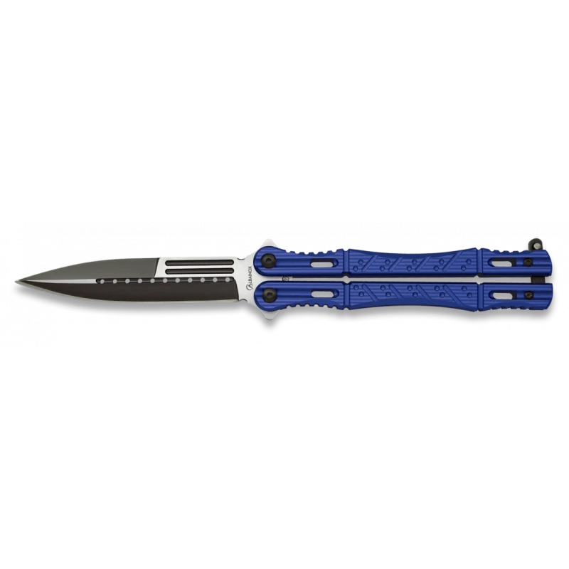 Avec le couteau papillon Albainox Night Fighter rĂ©fĂ©rence 02101, vous allez devenir le meilleur combattant de la nuit ! Et autant vous dire tout de suite que ce couteau balisong ne passera pas inaperçu en raison de son manche bleu Ă©lectrique en aluminium : un manche autant rĂ©sistant qu’Ă©lĂ©gant. Pari rĂ©ussi pour le fabricant Espagnol Albainox qui a conçu un couteau papillon ergonomique dotĂ© d’une bonne tenue de main mĂŞme en cas d’utilisation prolongĂ©e. La lame aussi est très originale : de longueur 10,4cm, elle est fabriquĂ©e en acier inoxydable blanc mais noir sur certaines parties. On peut Ă©galement apercevoir sur la lame diffĂ©rents motifs : deux rectangles lĂ©gèrement arrondis ainsi que de nombreux cercles : 11 pour ĂŞtre très prĂ©cis. C’est certain, la lame ne ressemble Ă aucune autre et c’est lĂ toute la force de ce couteau papillon Albainox Night Fighter 02101 ! Bien prĂ©sentĂ©, le balisong est livrĂ© dans une jolie boĂ®te colorĂ©e : parfait si vous comptez l’offrir en cadeau Ă un ami.