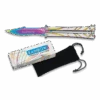 Le Benchmade 85 est un couteau papillon issu de la sĂ©rie Balisong de la cĂ©lèbre marque AmĂ©ricaine. Le Billet Ti Balisong est un modèle d’exception, intĂ©grant une poignĂ©e en titane monobloc extrĂŞmement robuste et design, notamment grâce aux nombreux ajours. Soulignons que le manche titanium mesure ici 14cm de long, pour une prise en main toujours très confortable, agrĂ©able. Pour en prendre le plus grand soin, vous pourrez compter sur un Ă©tui de protection en nylon noir, sur lequel on observe le motif papillon qui n’est autre que l’icĂ´ne officielle de la marque Benchmade.