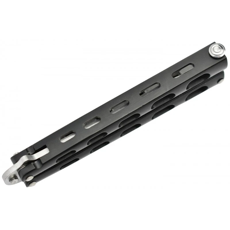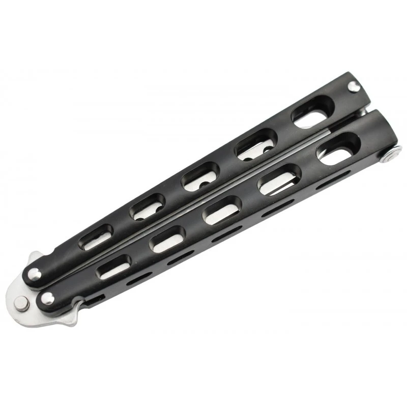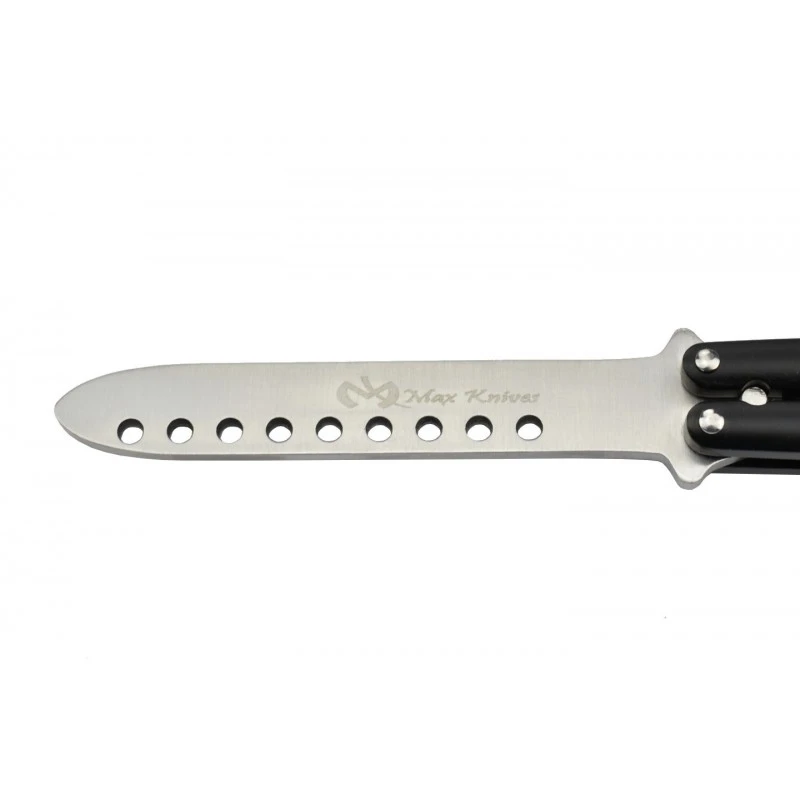 Le Max Knives P33BK est un couteau papillon destinĂ© Ă l’entraĂ®nement, afin de se perfectionner au maniement du balisong. Il possède une lame sans tranchant, Ă bout arrondi, en acier inoxydable rĂ©sistant Ă la corrosion, ajourĂ©e de nombreuses fois pour un style toujours plus marquĂ©. Sur la face avant de la lame, on peut observer le logo Max Knives au-dessus des ajours, ce qui fera bien sĂ»r très plaisir aux fans de la marque Max Knives. La lame assure des manipulations toujours très sĂ»res afin que l’utilisateur ne vienne jamais se blesser Ă l’usage.