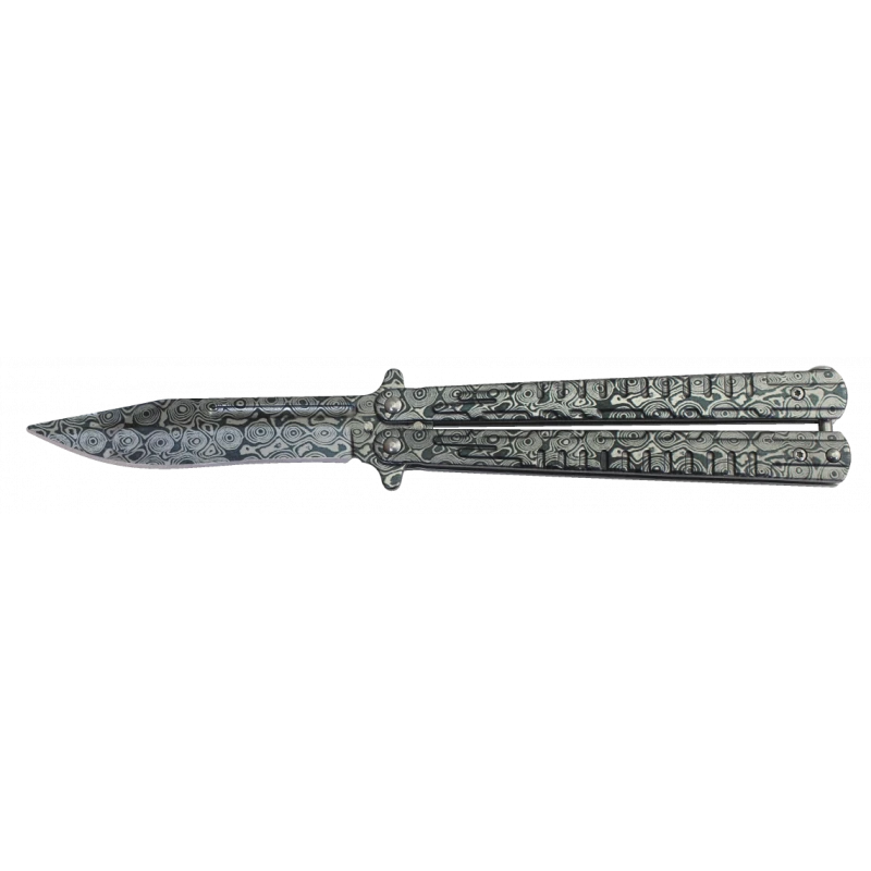 La lame de 10 cm est fabriquĂ©e en acier inoxydable de style damas. L’acier damas est rĂ©putĂ© pour sa beautĂ© naturelle et ses motifs distinctifs. Chaque lame est unique, avec des motifs ondulĂ©s et tourbillonnants qui ajoutent une touche d’Ă©lĂ©gance Ă ce couteau papillon.