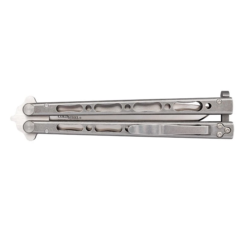 Le couteau papillon Cold Steel Hidden Angel Drop Point est dotĂ© d’un manche en acier inoxydable SUS630. De couleur gris, il est ajourĂ© Ă plusieurs reprises par des formes ressemblant Ă des rectangles aux bords arrondis ou encore tout simplement des petits cercles. La longueur de la poignĂ©e est lĂ©gèrement supĂ©rieure Ă 15cm, ce qui amène une longueur totale du balisong d’environ 26cm. Existe aussi en version lame clip point.
