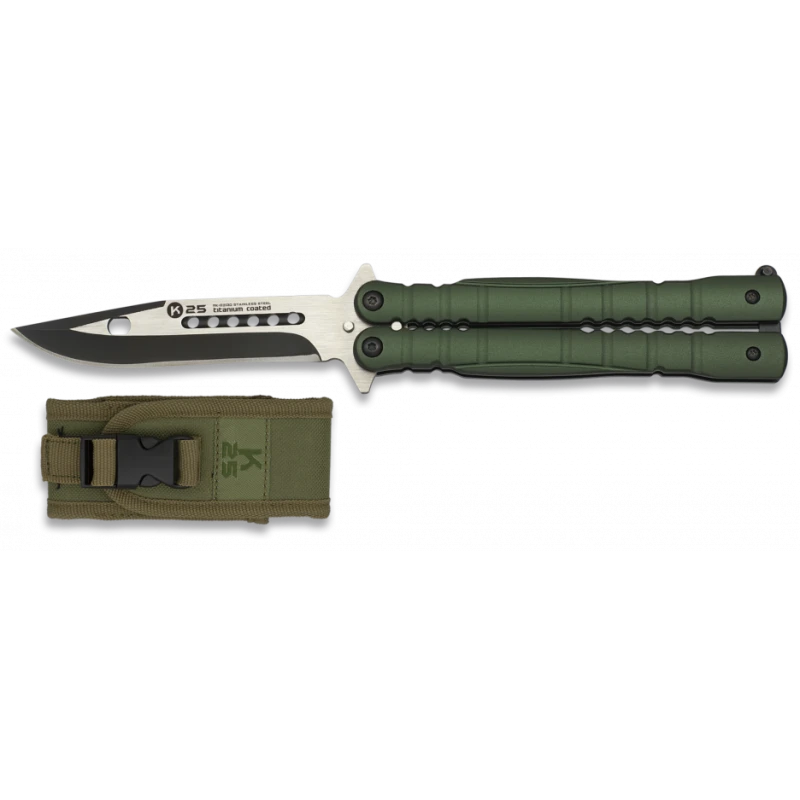 Ce couteau papillon K25 02130 dispose d’un manche vert en aluminium qui ne laissera personne indiffĂ©rent, et certainement pas les militaires. Un manche qui en plus d’ĂŞtre design, se paye le luxe d’ĂŞtre très ergonomique avec une excellente prise en main pour l’utilisateur. Tout le savoir-faire Espagnol sur ce balisong au rapport qualitĂ©/prix juste excellent ! Et pour que le transport ne soit jamais un obstacle Ă votre rĂ©ussite, ce couteau papillon est vendu avec son Ă©tui en nylon vert kaki K25. Un Ă©tui de protection en parfaite harmonie avec le balisong !