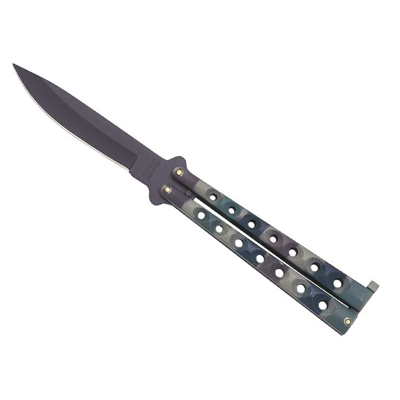 Grâce Ă son manche camouflage de longueur 12.5cm, ce couteau papillon Keen Blades 57125 est muni d’une allure très militaire. Balisong oblige, ce modèle est muni d’un manche en deux parties : chaque partie intègre exactement 7 trous bien alignĂ©s de quoi confĂ©rer un look stylĂ© au couteau papillon. Grâce Ă son petit gabarit (12,5cm), vous pourrez emporter ce couteau d’entraĂ®nement très facilement au quotidien.