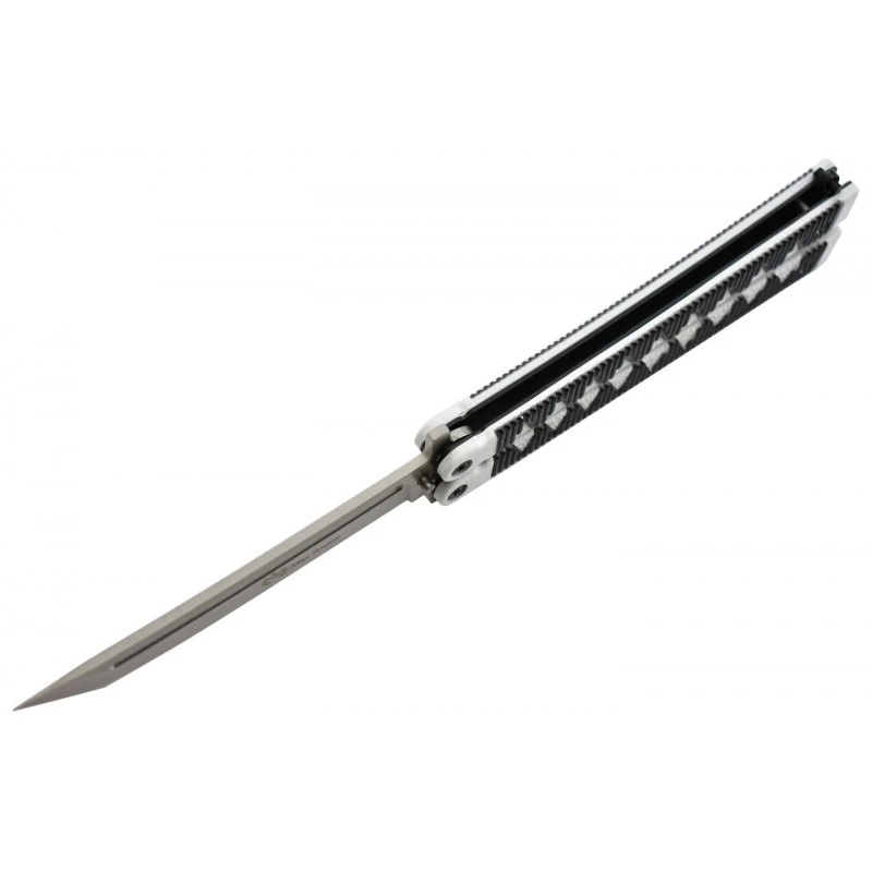 Celles et ceux qui aiment les couteaux papillons d’inspiration japonaise auront beaucoup de mal Ă rĂ©sister Ă l’appel du Max Knives P46S. Un balisong qui sĂ©duit par sa forme courbĂ©e au niveau du manche de 127mm de long en aluminium blanc ainsi que noir. Le tressage japonais ne vous laissera probablement pas indiffĂ©rent(e). AgrĂ©able Ă prendre en main, la poignĂ©e est très visuelle et riche en contraste : on peut d’ailleurs observer de nombreux triangles blancs par dessus le fond noir.