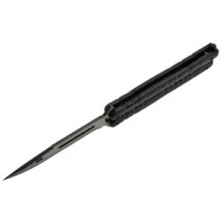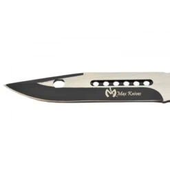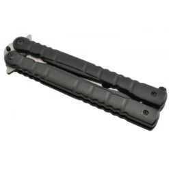 Le Max Knives P49 est un balisong dotĂ© d’une lame drop point stylisĂ©e. Elle est en effet bicolore, Ă savoir grise et noire, avec une fabrication en 3cr13, un acier inoxydable assurant une bonne rĂ©sistance face Ă la corrosion. Mais ce qui fait toute l’originalitĂ© de la lame de 103mm, c’est aussi ses ajours au niveau du centre mais aussi un unique trou plus important vers la pointe. En plus de contribuer au design, cela a Ă©galement un impact sur le poids du couteau papillon. C’est également le cas du matĂ©riau utilisĂ© pour le manche du Max Knives P49, Ă savoir l’aluminium, ici anodisĂ© noir. LĂ©ger, il ne craint pas la corrosion et confère une forte ergonomie, comprenez un grand confort de prise en main. Son style simple mais Ă©lĂ©gant ne manquera pas de plaire au plus grand nombre, tout comme le prix de vente relativement bas du couteau papillon. La jolie poignĂ©e comprend quelques rainures verticales positionnĂ©es de la mĂŞme façon sur les deux parties mobiles. Longueur du balisong en position fermĂ©e : 127mm.
