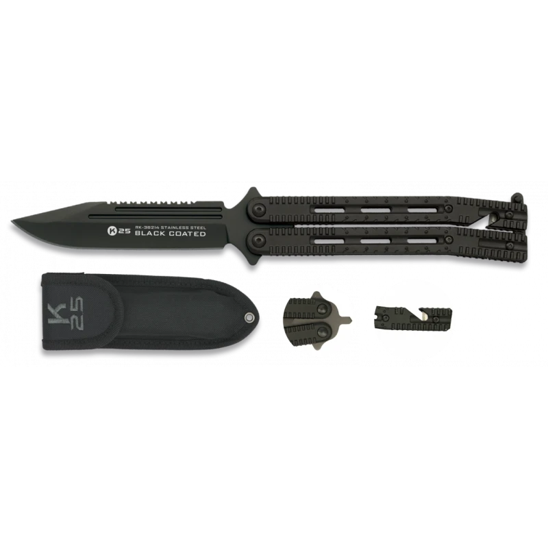 Un couteau papillon tactique signĂ© K25 qui a du style. Tout d’abord son manche au design travaillĂ© est pourvu d’un coupe ceinture en son extrĂ©mitĂ© (sur l’une des branches du balisong). Sa lame quant Ă elle, est dotĂ©e d’un revĂŞtement titane, et de 2 tranchants : un lisse et un crantĂ©. Une fois le couteau repliĂ©, un brise vitre se dĂ©voile aux niveaux des articulations. Enfin, ce couteau papillon K25 est livrĂ© avec un Ă©tui en nylon, très pratique pour protĂ©ger votre balisong.