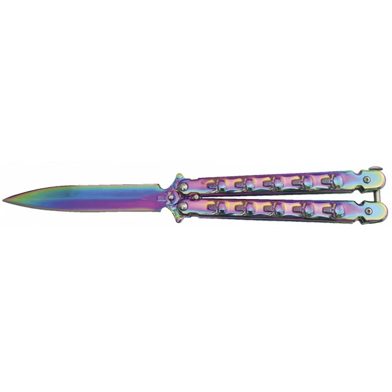 Le motif arc-en-ciel qui pare ce couteau papillon lui confère une allure spectaculaire. Chaque mouvement du manche rĂ©vèle un dĂ©gradĂ© de couleurs Ă©blouissant, crĂ©ant ainsi un effet visuel Ă couper le souffle. C’est un vĂ©ritable plaisir pour les yeux.