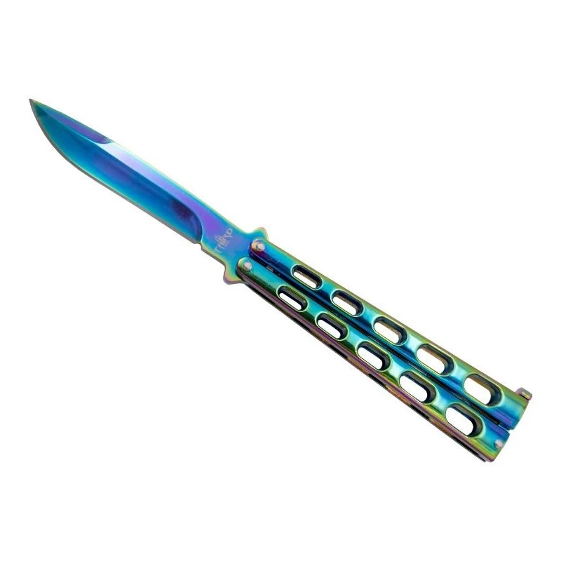 Ce qui rend ce couteau vraiment spĂ©cial, c’est sa finition arc-en-ciel unique. Avec des couleurs chatoyantes qui rappellent les nuances de l’arc-en-ciel, ce couteau papillon ne manquera pas d’attirer l’attention, dans le bon sens du terme bien sĂ»r. Osez l’originalitĂ© avec ce balisong Third !