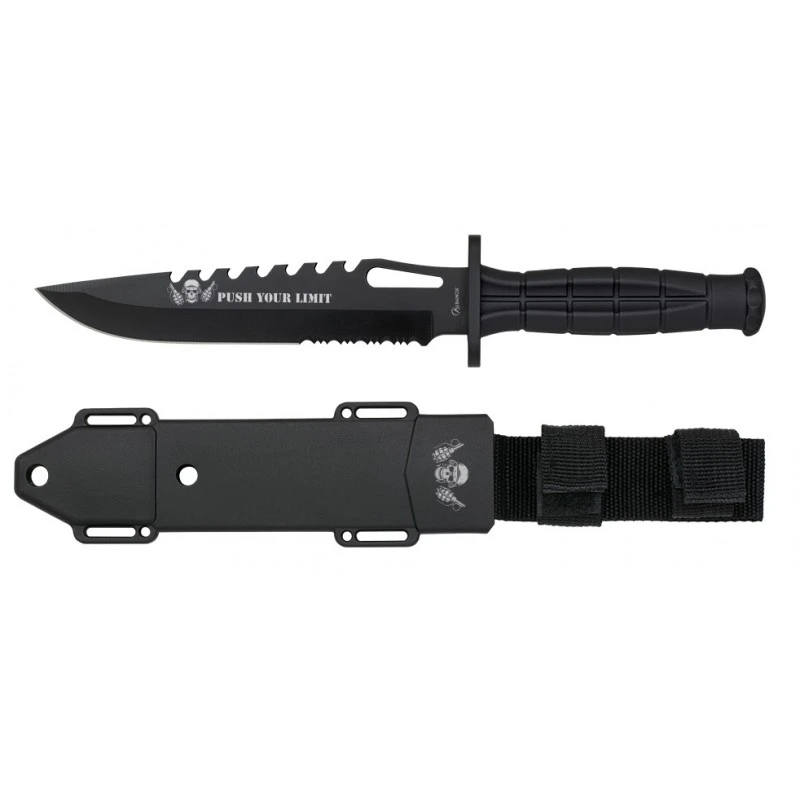 Le couteau tactique fait partie des accessoires indispensables Ă emporter lors d’un stage de survie ou d’une mission. Le 32568 de chez Albainox est entièrement noir, avec un look agressif sublimĂ© par des illustrations reprĂ©sentant une tĂŞte de mort entre deux grenades et un texte « Push your limit », autrement dit repousse tes limites. D’une longueur de 18 cm, sa solide lame en acier inoxydable 3Cr13Mov est pourvue d’un tranchant lisse et crantĂ© et d’un dos Ă©quivalent Ă une scie : une association qui offre une grande polyvalence d’usage. Ce poignard est muni d’un manche ergonomique en ABS pour une meilleure prise en main et adhĂ©rence. Entre la poignĂ©e et la lame se trouve une garde permettant de garantir la sĂ©curitĂ© de l’utilisateur lors de la manipulation. Le fabricant espagnol inclus avec le couteau de survie 32568, un étui rigide en abs/nylon adaptĂ© pour un port Ă la ceinture et Ă la cuisse. L’ensemble vous sera livrĂ© dans une boĂ®te de prĂ©sentation.Â