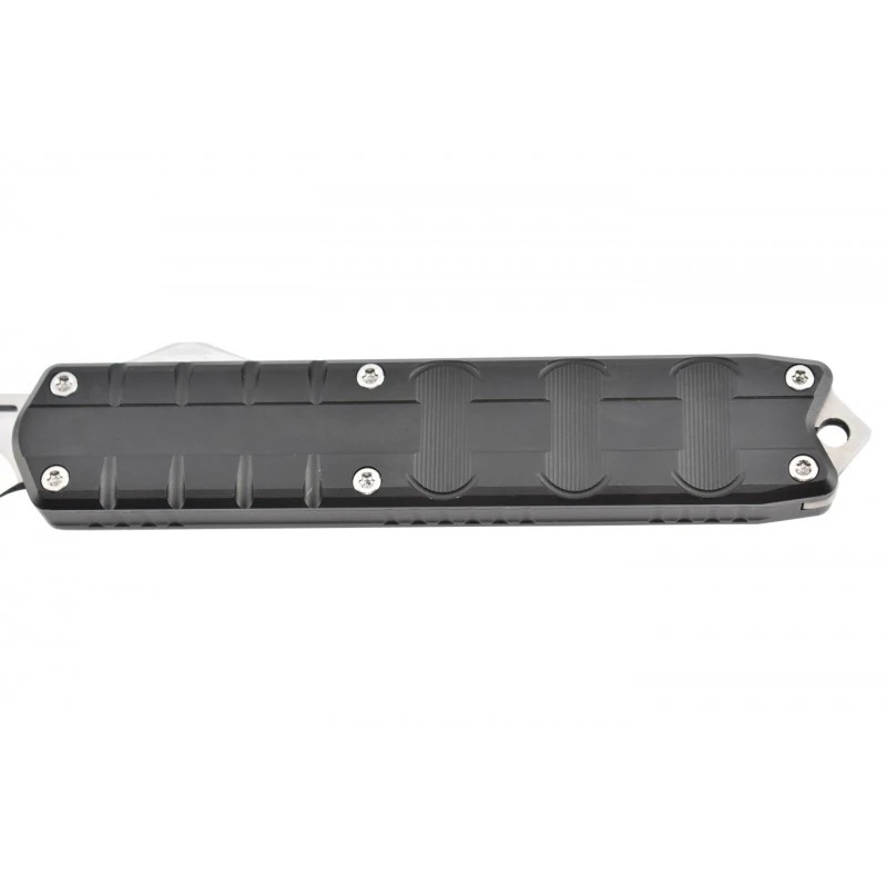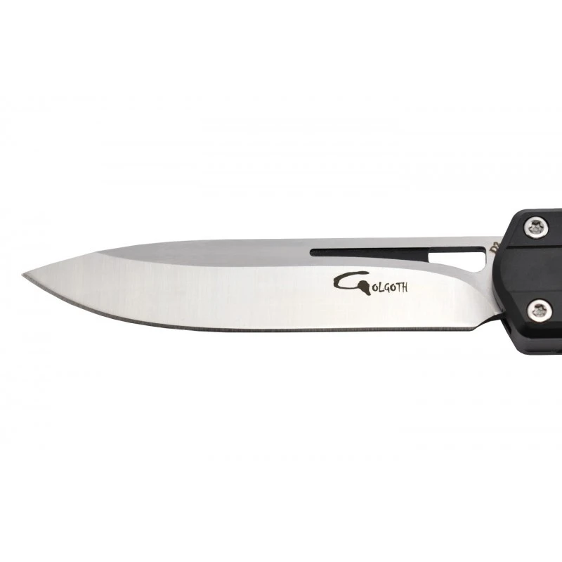 Le couteau automatique Golgoth G9ST possède une lame en acier D2, Ă simple tranchant, dont la duretĂ© s’Ă©lève Ă 60HRC. AjourĂ©e pour un style plus prononcĂ©, plus marquĂ©, la lame est Ă©galement embellie par le logo Golgoth, elle peut aussi ĂŞtre gravĂ©e par un texte au choix au niveau des deux faces (avant/arrière). Notez bien le fait que le manche noir en aluminium est de type 6061-T6.