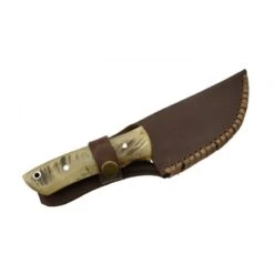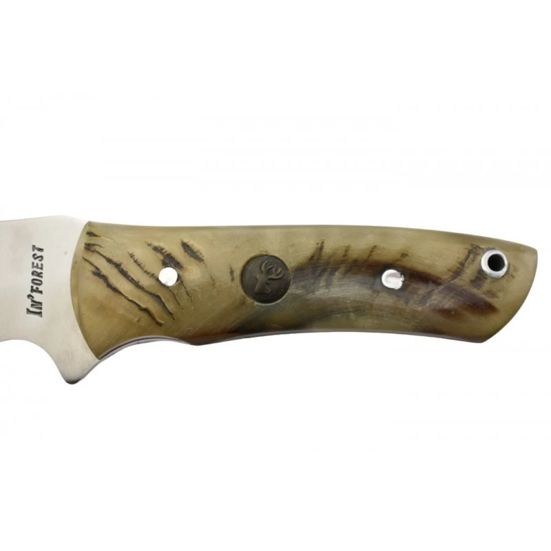 Ce couteau à dépouiller de la marque In’Forest est équipé d’un manche en corne de bélier sur lequel figure un écusson avec motif cerf. Celui-ci loge un trou de lanière, un petit détail qui améliore grandement la transportabilité ! La corne étant un produit naturel, son design peut varier selon le modèle reçu.