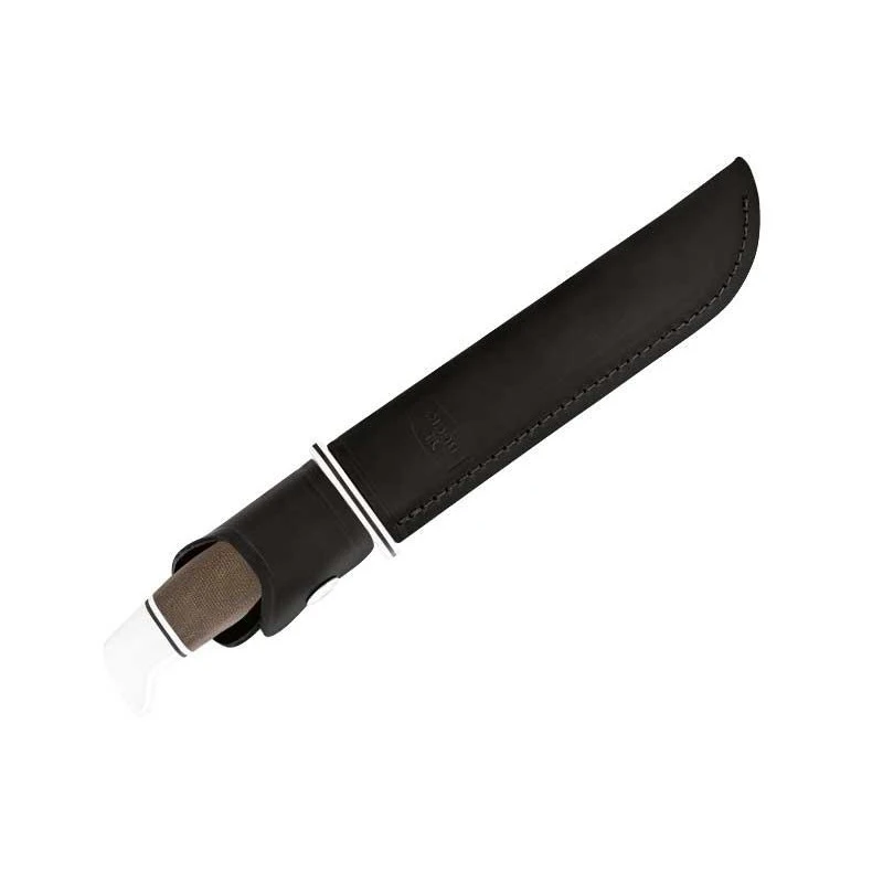 Le Buck General Pro 120, c’est aussi un manche en micarta toile verte de 117mm de long, qui en plus d’une forte Ă©lĂ©gance, procure aussi un grand confort de prise en main. Un critère Ă prendre en considĂ©ration au moment du choix de son poignard de chasse ! On soulignera la prĂ©sence d’une mitre ainsi qu’une garde en aluminium afin que les utilisations du couteau soient sĂ»res Ă chaque instant. Le General Pro pourra ĂŞtre facilement rangĂ©, et donc transportĂ©, dans son Ă©tui en cuir noir.