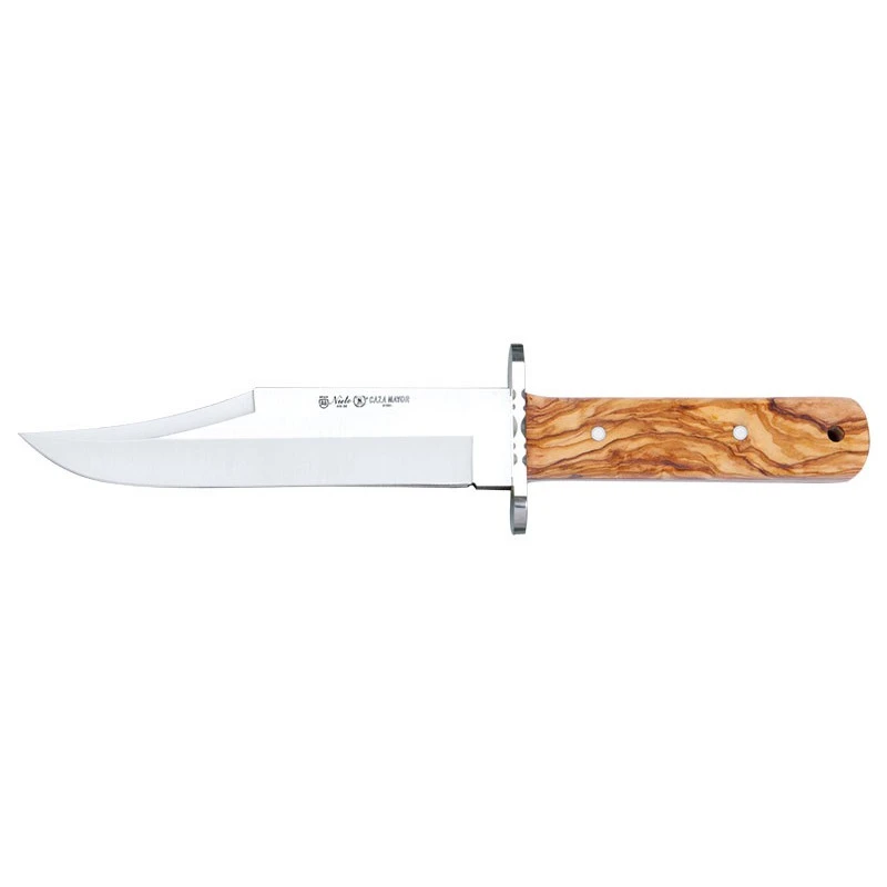 Le Caza Mayor (rĂ©fĂ©rence NI11043) par Nieto est un poignard de chasse extrĂŞmement performant. Il faut dire qu’il possède une grande lame clip point de longueur 17cm en acier AN-58 assurant un tranchant de qualitĂ© en toutes circonstances. Une grande lame fixe avec garde sur laquelle on peut apercevoir les textes « Nieto » et « Caza Mayor » en rĂ©fĂ©rence au fabricant ainsi qu’au nom du poignard. Ă€ noter que la lame peut ĂŞtre personnalisĂ©e, ou plutĂ´t gravĂ©e par les textes de votre choix, au niveau des deux faces, comme par exemple par le prĂ©nom du chasseur ou encore sa date de naissance. Ce poignard de chasse Nieto Caza Mayor dispose Ă©galement d’un manche en bois olivier avec veinures apparentes pour la touche esthĂ©tique. Un joli manche de longueur 13cm qui est très ergonomique avec une prise en main des plus confortables. Grâce Ă l’Ă©tui en cuir fourni, il sera très facile de prendre soin de son poignard Nieto Caza Mayor au quotidien. Un vĂ©ritable compagnon de chasse sur qui on peut compter !