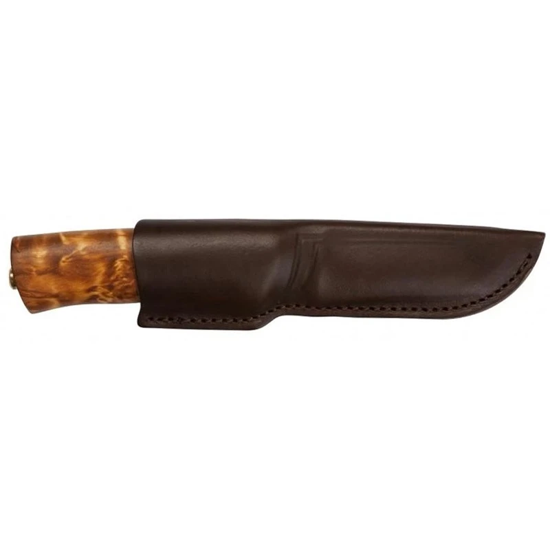 Le Helle Eggen H201075 dispose aussi d’un joli manche conçu en bois bouleau, avec une sorte de boucle cĂ´tĂ© lame afin de former un protège-doigts. Un couteau de chasse fixe qui ne plaisante pas avec la sĂ©curitĂ© ! La poignĂ©e en bois bouleau se rĂ©vèle très confortable, notamment pour les mains de tailles moyennes et grandes (longueur du manche 11cm). Ce poignard de chasse Eggen par Helle, fixe avec demi-garde, est vendu avec sa gaine en cuir marron servant Ă ranger/protĂ©ger le couteau lors des dĂ©placements/mouvements.