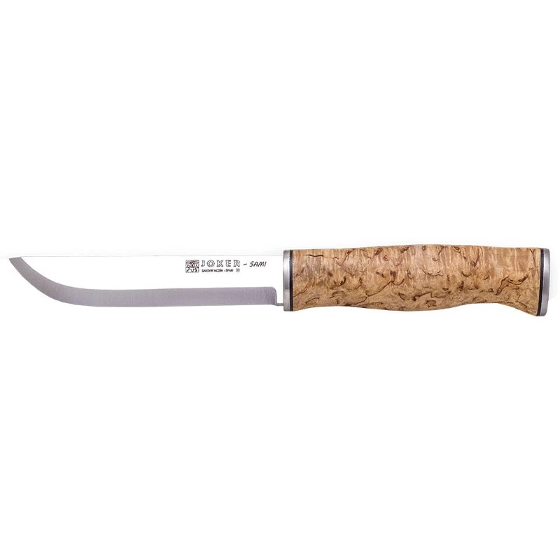 Le manche de 115mm est conçu en bois bouleau frisé, et a une forme qui procure son lot de confort en terme de prise en main. Le poignard Joker Sami est livré avec son étui en cuir marron de grande qualité, avec des coutures à haute résistance.