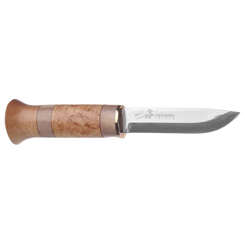 Le Järven Karesuando est un couteau nordique fixe qui convient pour bons nombres d’activitĂ©s Outdoor : survie, camping, chasse, bushcraft … Le poignard possède une lame fixe de 10cm de long en acier inoxydable 12C27 Sandvik. Robuste et tranchante, la lame est un alliĂ© de confiance lors des aventures, elle est marquĂ©e par le logo Karesuando, marque SuĂ©doise haut de gamme. N’oubliez pas la gravure sur lame en supplĂ©ment pour inscrire le texte de votre choix ! Cela apportera un peu de douceur, de rĂ©confort, Ă vos excursions les plus palpitantes ! Le poignard Karesuando Järven 3513 est dotĂ© d’un manche en bois de bouleau avec insert en bois de renne, il est très agrĂ©able Ă regarder, mais aussi Ă manier sans oublier la robustesse Ă toute Ă©preuve. Couteau nordique livrĂ© avec son bel Ă©tui de protection en cuir, duretĂ© HRC 57, longueur totale 21cm.
