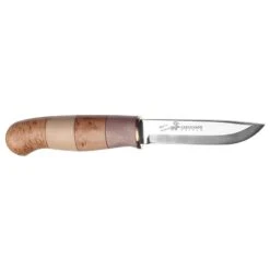 Pour les activitĂ©s Outdoor les plus exigeantes, faites confiance au Ripan ! Ce couteau nordique Karesuando possède une lame fixe mesurant 10cm de long, elle est fabriquĂ©e en acier inoxydable 12C27 Sandvik. Pour votre information, sachez que la duretĂ© de la lame est de 57HRC. La lame fixe, au tranchant lisse, est embellie par le logo Karesuando, ce dernier est accompagnĂ© du texte « Made in Sweden » indiquant une fabrication SuĂ©doise. Le Ripan est muni d’un manche de 11cm de long en bois de bouleau et bois de renne, sa forme bombĂ©e le rend agrĂ©able Ă manier, Ă utiliser au jour le jour. Qui plus est, il confère une sensation de grande robustesse, de soliditĂ© extrĂŞme, un poignard fiable qui ne vous abandonnera pas face Ă la première difficultĂ© rencontrĂ©e. Garanti pendant 10 annĂ©es, le Ripan Karesuando est en plus livrĂ© avec son Ă©tui en cuir afin de le protĂ©ger efficacement, et avec goĂ»t, lors des mouvements et dĂ©placements.