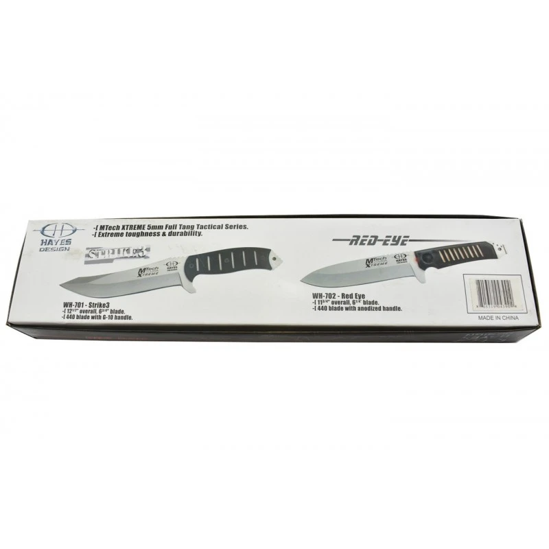 Ce grand couteau fixe tactique Mtech USA Red Eye bĂ©nĂ©ficie d’une lame de 165mm de forme spear point, construite en acier inoxydable 440C. Celle-ci est robuste et tranchante, elle est enrichie du logo « Mtech USA Xtreme » ainsi que « Hayes Design ». L’Ă©tui fourni vous permet non seulement de protĂ©ger le poignard, mais aussi le transporter beaucoup plus facilement. Longueur totale : 30cm.