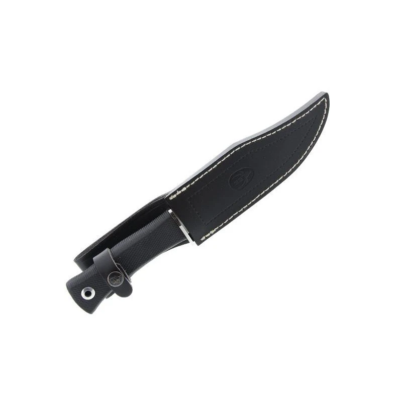 Portant la référence 9290, le poignard Muela « 21733 » se dote d’une lame de longueur 17cm fabriquée en acier inox X50CrMoV15. À bout pointu, cette lame tranchante s’avère marquée par le logo officiel du fabricant Muela (Espagne). Vous pouvez aussi la personnaliser par les textes de votre choix, parfait pour offrir le poignard Muela « 21733 » à un ami chasseur ou à soi-même. À noter que ce modèle conviendra également pour d’autres activités Outdoor, notamment la survie en pleine nature. Le poignard Muela « 21733 » intègre aussi un manche fabriqué en gomme noire, il est aussi élégant qu’ergonomique (excellente prise en main car antidérapant). On notera aussi la présence d’une garde en inox afin de garantir des utilisations en toute sécurité du poignard . Modèle livré avec son étui en cuir noir pour une protection de tous les instants durant les déplacements et mouvements.