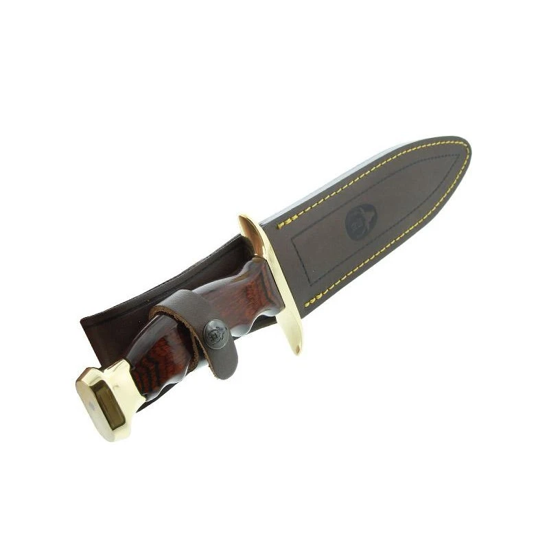 Le Bowie est un poignard incontournable de toute la gamme Muela (marque Espagnole). Les chasseurs l’apprĂ©cieront Ă©normĂ©ment pour sa grande lame fabriquĂ©e en acier inoxydable (longueur de 19cm). Ă€ noter que ce modèle est Ă©galement disponible avec une lame encore plus grande (26cm) ou au contraire plus petite. C’est clairement une question de prĂ©fĂ©rence sachez juste que peu importe la taille, la lame est toujours dĂ©corĂ©e par le logo Muela ainsi que par le nom du poignard, Ă savoir le Bowie. Elle est aussi personnalisable par gravure au niveau des deux faces (voir bouton ajouter une gravure). Ce modèle rĂ©fĂ©rence 9259 est muni d’un manche en stamina avec extrĂ©mitĂ©s dorĂ©es pour une Ă©lĂ©gance de tous les instants durant les sessions de chasse ou aventures Outdoor. Gardez bien en tĂŞte que le poignard Muela Bowie 9259 est livrĂ© avec son Ă©tui en cuir pour une protection efficace durant les dĂ©placements et mouvements.
