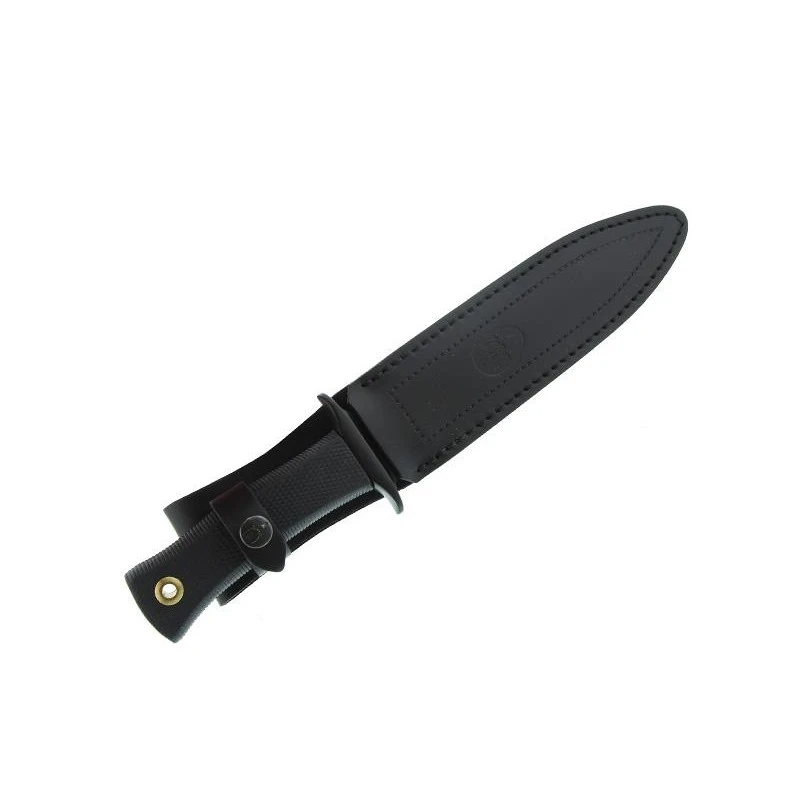 Le Muela ESCORP rĂ©fĂ©rence 9287, modèle avec lame de 19cm de longueur en acier inoxydable 420. Si la longueur de lame est prĂ©cisĂ©e, c’est parce que le modèle ESCORP existe aussi avec une lame encore plus grande (longueur 26cm, voir Muela ESCORP 9207) La lame de 19cm se rĂ©vèle particulièrement tranchante au quotidien, elle bĂ©nĂ©ficie aussi d’une excellente robustesse (rĂ©sistance Ă la rouille). Comme très souvent avec le fabricant Espagnol Muela, on retrouve le logo marquĂ© sur la lame, ainsi que le nom du modèle du poignard, ici ESCORP. N’oubliez pas que le site web le-couteau.com vous permet de personnaliser ce poignard au moyen d’une gravure (voir bouton situĂ© ci-dessous). Parfait pour la chasse, le poignard Muela ESCORP 9287 dispose aussi d’un manche noir fabriquĂ© en gomme, un matĂ©riau antidĂ©rapant qui ne conduit pas le froid. Il faut souligner le fait que le manche est dĂ©corĂ© par un losange avec « MM » en rĂ©fĂ©rence Ă la marque Muela, un petit dĂ©tail qui fera plaisir Ă tous les fans. Et pour en prendre soin au quotidien, les chasseurs pourront toujours compter sur un bel Ă©tui de protection en cuir noir. Un Ă©tui de qualitĂ© que vous pouvez observer plus en dĂ©tail sur les autres images du produit.