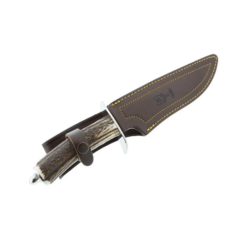 Le modèle Magnum est un poignard de chasse fabriquĂ© et commercialisĂ© par la marque Espagnole Muela. On retrouve un manche en bois de cerf vĂ©ritable qui apporte beaucoup de style au poignard en plus d’une ergonomie sans faille (excellente prise en main). On peut le dire, c’est un manche très « nature » ! On notera Ă©galement la prĂ©sence d’une garde en inox permettant une utilisation de la lame en toute sĂ©curitĂ©. De forme atypique, la lame est une fois n’est pas coutume fabriquĂ©e en acier inoxydable avec marquage du logo Muela. Elle mesure prĂ©cisĂ©ment 19cm de longueur ce qui confère une excellente puissance. Ă€ noter que le poignard Muela Magnum 9229 est vendu avec son Ă©tui en cuir, un Ă©tui de protection de très grande qualitĂ© toujours dĂ©corĂ© par le logo Muela.
