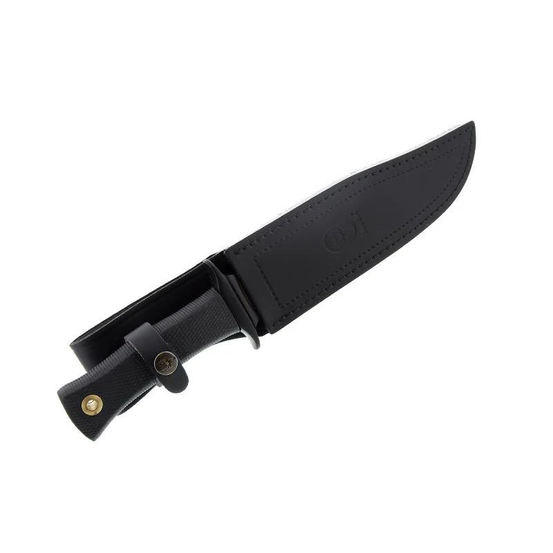 Ce couteau Ă lame fixe Muela se dote Ă©galement d’un manche fabriquĂ© en gomme noire. Il offrira Ă l’utilisateur une prise en main extrĂŞmement confortable, et ce, mĂŞme en cas d’une utilisation prolongĂ©e. Si la gomme est un matĂ©riau prisĂ© du fabricant Muela, c’est pour sa surface antidĂ©rapante assurant Ă la main de ne jamais glisser. Il faut aussi savoir que ce matĂ©riau a l’avantage de ne pas conduire le froid, très pratique pour les utilisations hivernales. Afin de ne jamais l’abĂ®mer, le poignard Muela Mirage 9301 (lame avec scie au dos) vous sera livrĂ© avec son Ă©tui de protection adaptĂ©. Un Ă©tui de qualitĂ© signĂ© Muela fabriquĂ© en cuir.